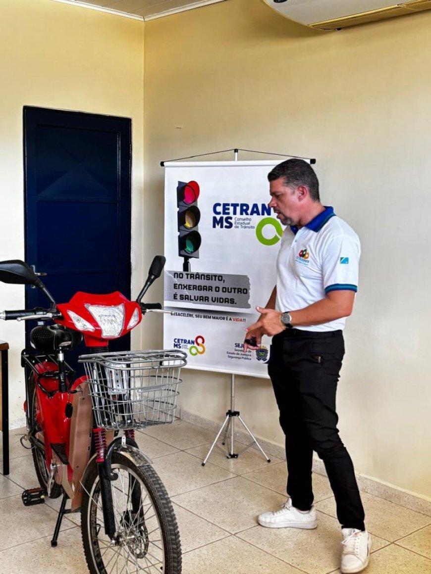 A palestra foi ministrada pelo Conselheiro do CETRAN/MS, Alandnir Cabral da Rocha, que abordou as diferenças técnicas e legais entre bicicletas elétricas, ciclomotores e outros veículos autopropelidos, bem como as exigências previstas no Código de Trânsito Brasileiro – CTB e nas resoluções do Conselho Nacional de Trânsito – CONTRAN. A ação contou com o apoio da GETRAN – Gerência de Engenharia e Tráfego e Sistemas Viários, órgão municipal responsável pela gestão do trânsito em Porto Murtinho, que tem como Gestor Municipal de Trânsito o senhor Osvaldo Anastácio Filho.